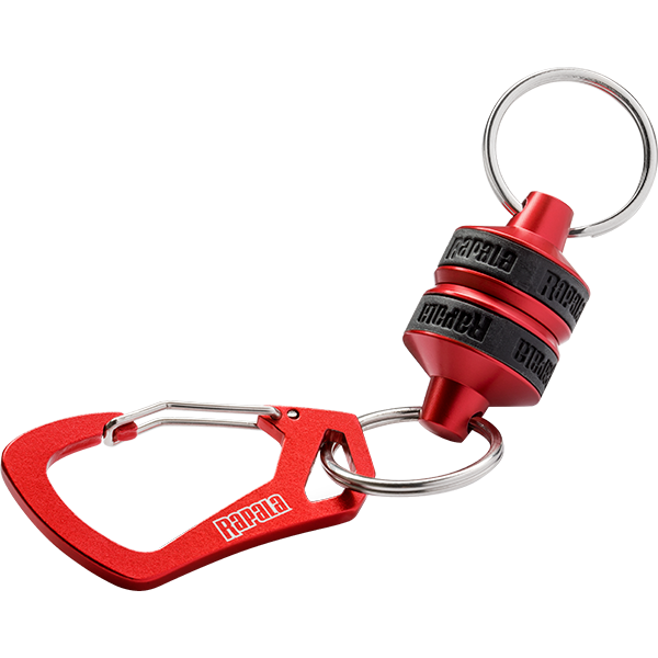 RCD - Rapala Custom Design series Powerful magnetic release with a carabiner clip is ideal for hanging nets and other big tools and accessories to fishing jackets or vests. Break-away magnets allow easy one-hand operation, releasing the hung tool with one pull. The magnets also make the re-attaching quick and easy.