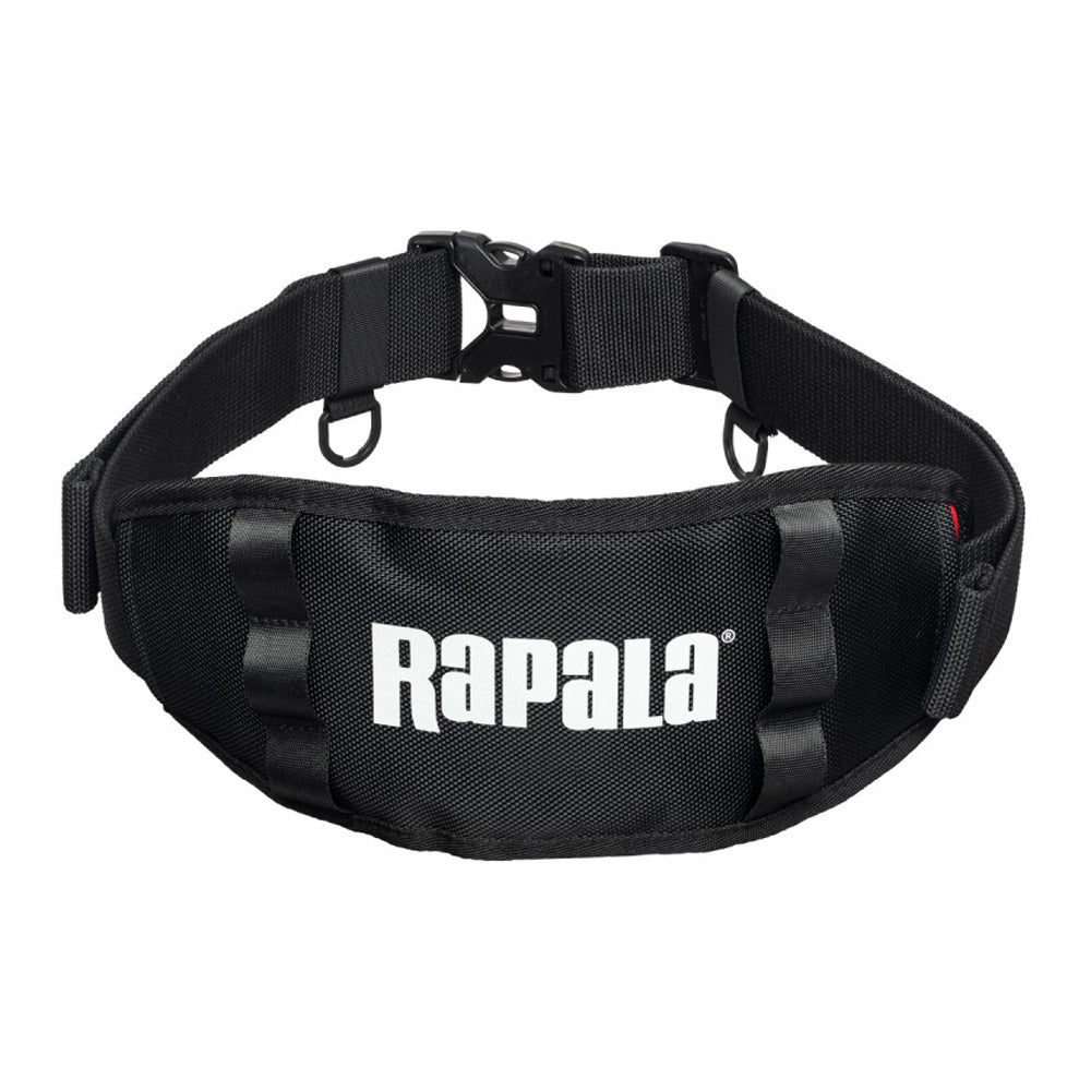 The Rapala Gear Belt System is a belt made of very resistant polyester, which can be used to store/attach various accessories or spinning gear. The belt fastens around the middle and can be adjusted in length. It closes with a Clip On buckle made of rigid plastic. On the side areas of the belt, two plastic "D Rings" are attached with velcro strips to which scissors, pliers, deburring tool, etc. can be attached if needed. The back area of the belt is much wider and higher, being lined with sponge material that does not hurt the skin during use and at the same time acts as a sweat absorbent.