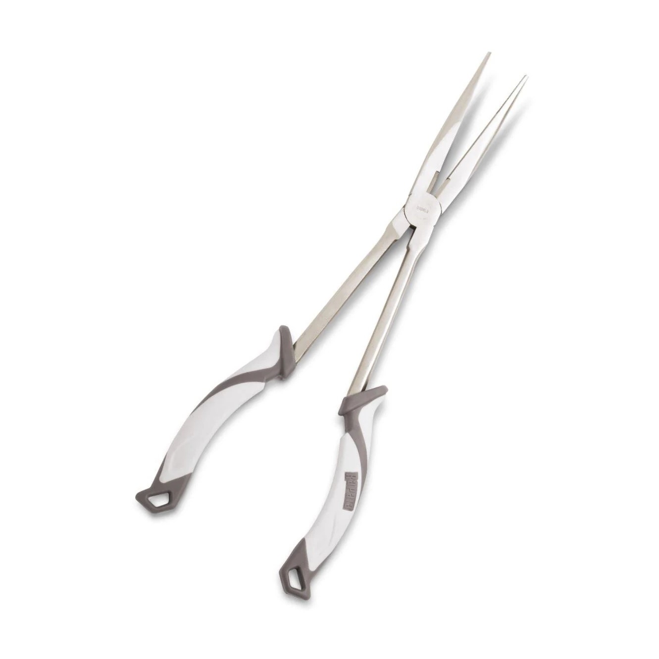 Rapala SACP11 Fisherman's 11" Pliers - Easily reach deep hooked baits and other hard to reach hookswith ease. Coastal color co-molded grips for a secure hand whiledigging deep to save your “lucky Rapala” lure. Line and hookside cutter. Nickel plated carbon steel construction to enhnacerust resistance. Extended Reach Side Cutter Co-molded Handles.